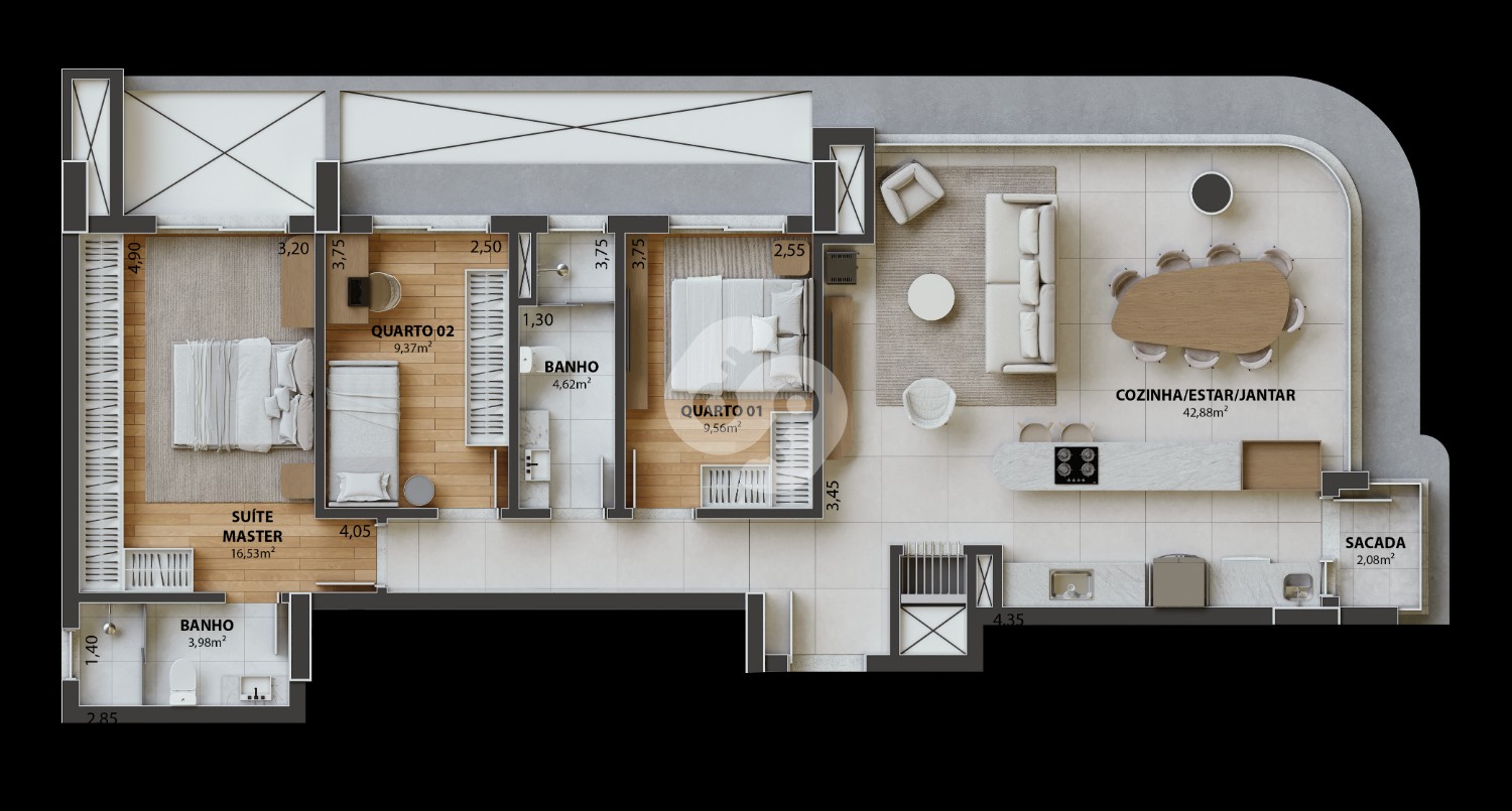 ◾ Apartamento sofisticado com 102,78m² privativos, apresentando um layout moderno que integra sala de estar, jantar e cozinha em um ambiente contínuo, iluminado e extremamente funcional. A planta privilegia amplitude e aproveitamento total dos espaços, criando um lar prático e acolhedor.