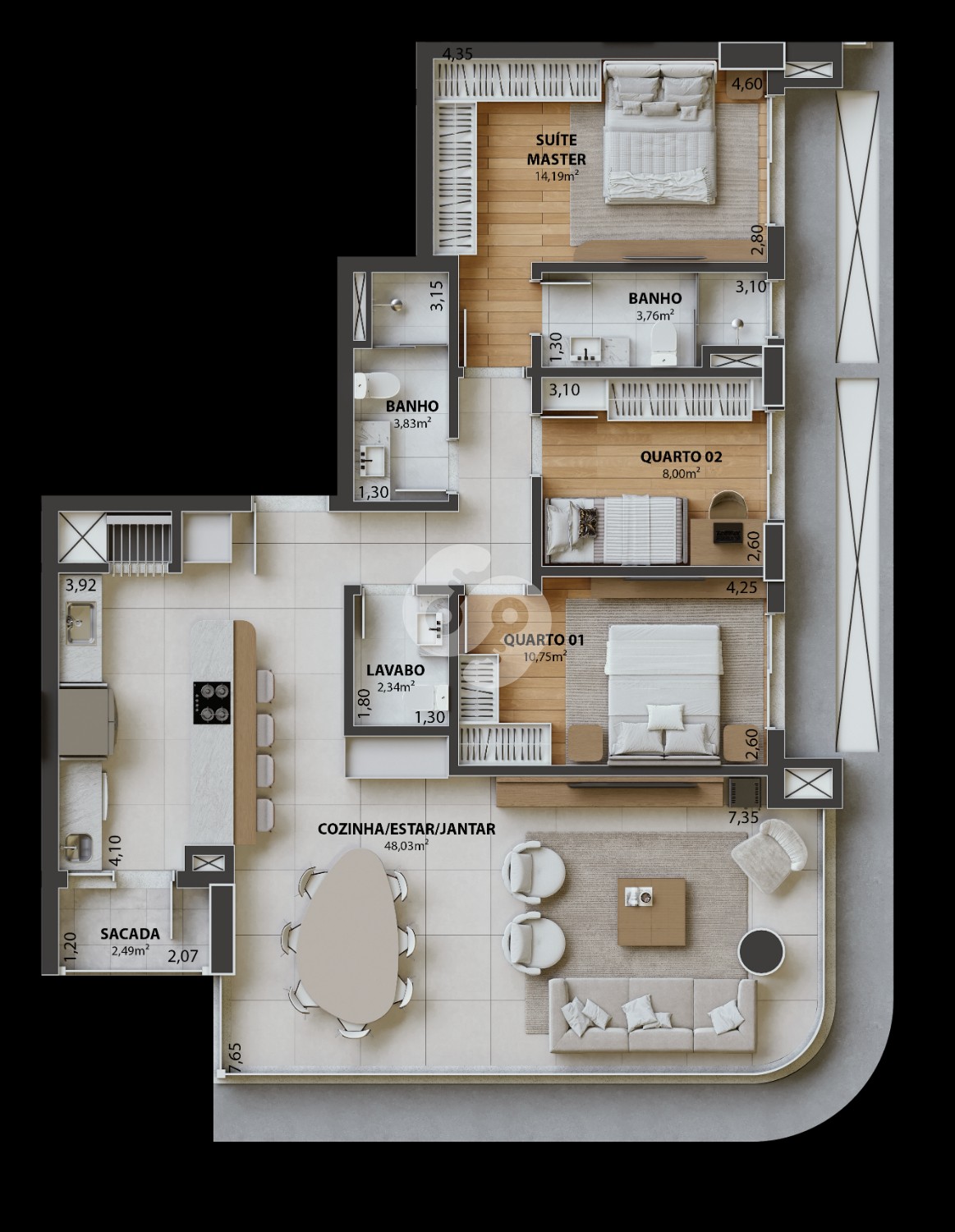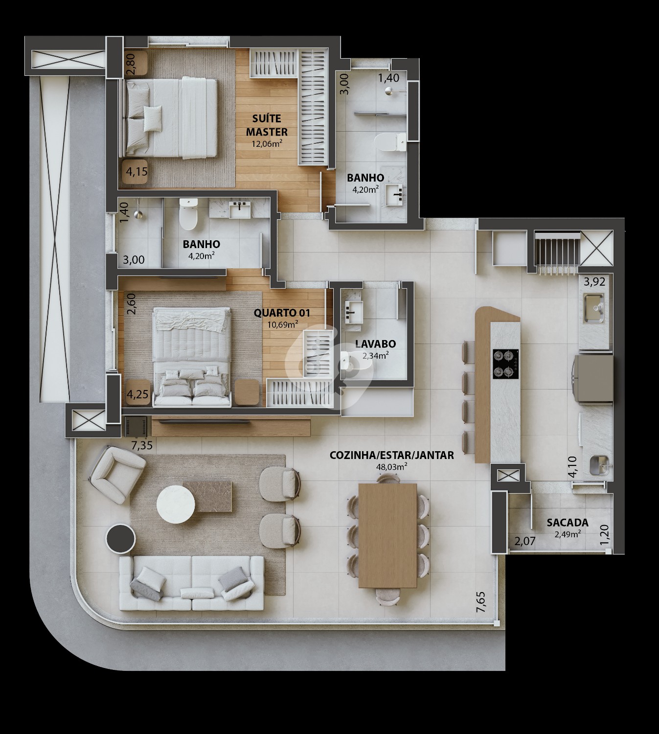 ◾ Os dois dormitórios são suítes, ambos projetados para garantir conforto e privacidade. O lavabo oferece comodidade à área social, enquanto a área de serviço com sacada aberta traz ventilação natural e mais praticidade no dia a dia.