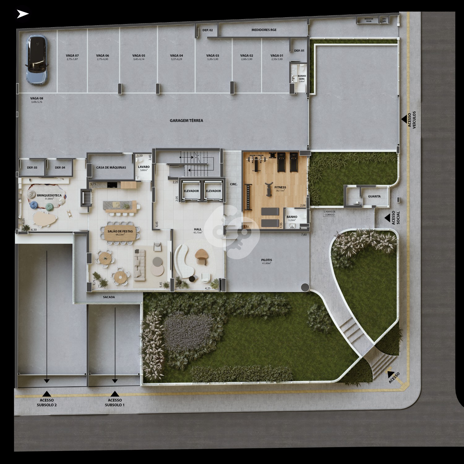 ◾ Garagens duplas ou lado a lado, todas com depósito individual, garantindo organização e praticidade ao morador.
